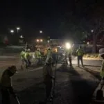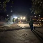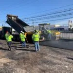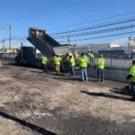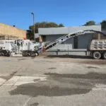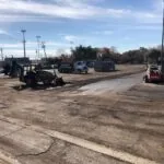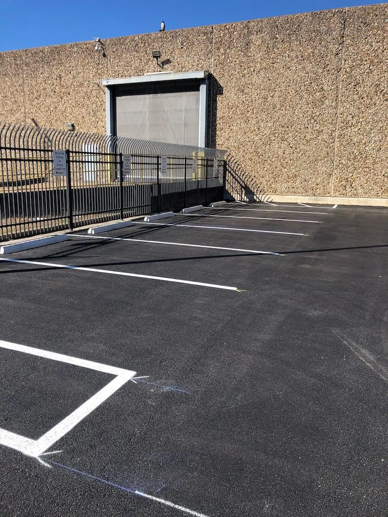Our first step was to remove all of the wheel stops in the parking lot. We then milled the parking lot to remove the asphalt to a depth of 2 inches; in the process, we discovered the existence of a previous overlay. Our next step was to install new asphalt. Most of the parking lot only required 2 inches of asphalt to replace the pavement we removed during the milling process, but some areas with base failure required additional asphalt depth. In total, we used 750 tons of asphalt to cover 52,750 square feet of pavement. We completed the milling and paving in a 16-hour day that started at 5 a.m. and ended at 9 p.m. We then returned to apply the pavement markings, stripe the parking lot, and install new wheel stops.