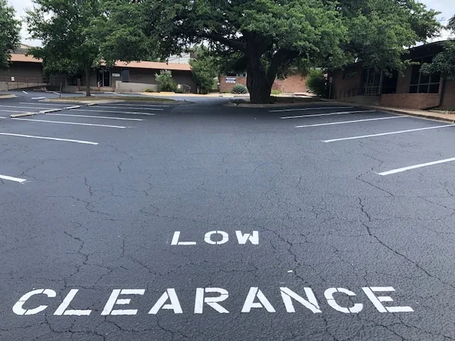 With the help of Dr. Cantu and the maps we prepared, we achieved the complete cooperation of all offices. We completed the sealcoating on Saturday and the striping on Sunday. There is a large live oak tree outside Dr. Cantu’s office that is between 200 and 300 years old. He is very proud and protective of this tree, and he was worried about delivery trucks hitting its branches. Therefore, about 100 feet from the tree, we applied a stencil that warned of the low clearance, making Dr. Cantu even happier with our work.