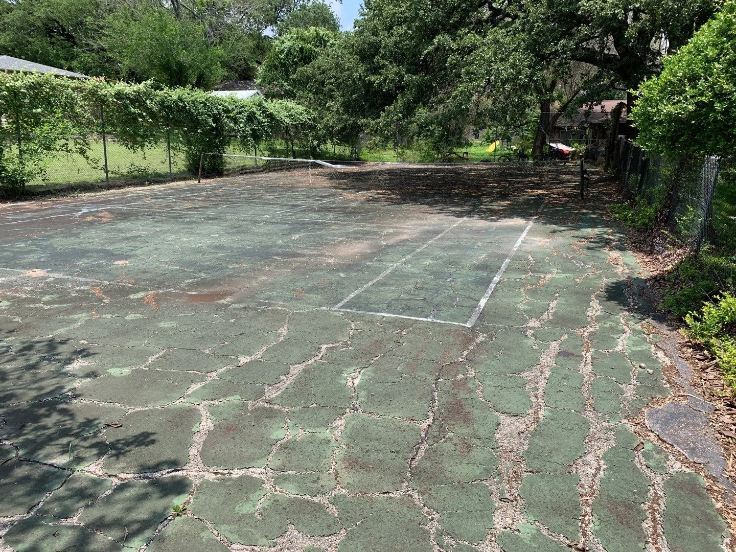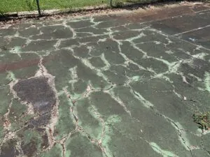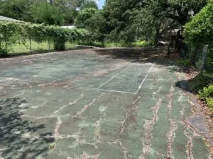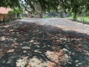Mr. Tisdale had two reasons for contacting us. First, he felt that his tennis court was an eyesore that needed to be addressed. We were able to recommend a cost-effective way to give the tennis court a fresh look. Second, he wanted to protect his driveway through sealcoating. We sealed both the tennis court and the driveway, then we re-striped the tennis court. We used a total of approximately 300 gallons of Jennite AE sealcoating. This covered about 5,750 square feet of pavement with two coats that were applied with a sprayer.