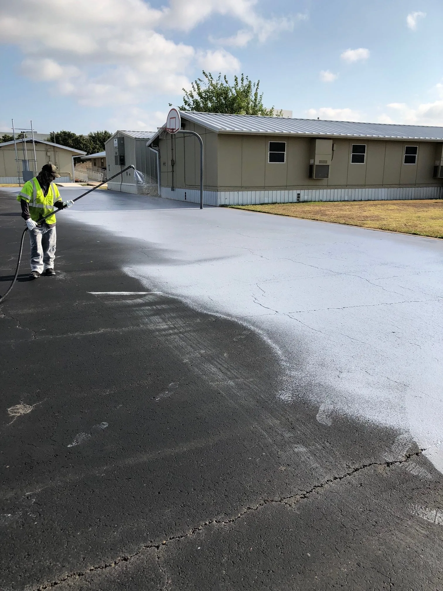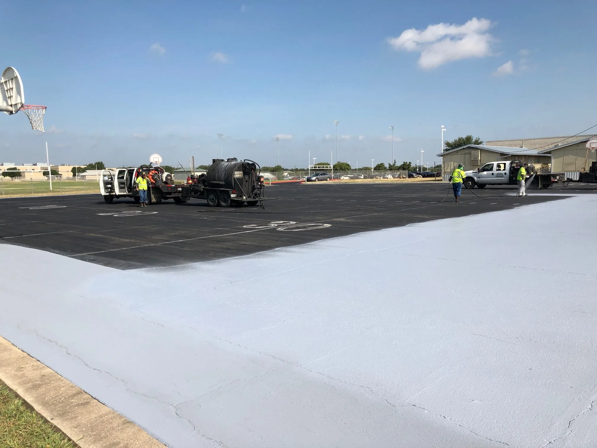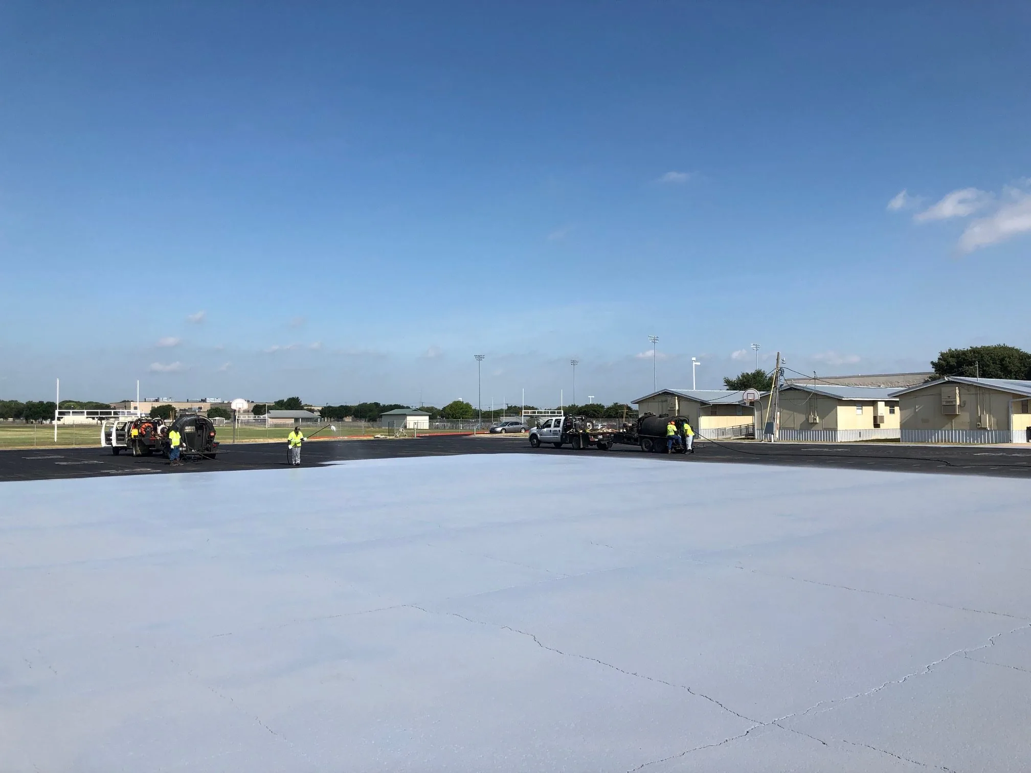 Summer days in Central Texas can be hot enough if you are relaxing on your deck. For students in a marching band who are practicing on an asphalt pavement during August, the heat radiating from the pavement can lead to unbearable or even dangerous temperatures. SunShield Solar Reflective Coating can reduce pavement temperatures to make the area more comfortable for people, but it also helps prevent pavement damage that the sun can cause. Alpha Paving is currently the only contractor in Texas applying the SunShield product. Previously, we applied SunShield on two other pavements at schools in the RRISD, the band practice lot at Westwood High School, and a play court at Deerpark Middle School. Band directors regularly note a temperature difference of 15 degrees between surfaces treated with SunShield and those not treated with SunShield. Therefore, the school district asked us to apply SunShield to the band practice lot at Westwood High School. We completed the four-stage process on three consecutive days in August 2019.