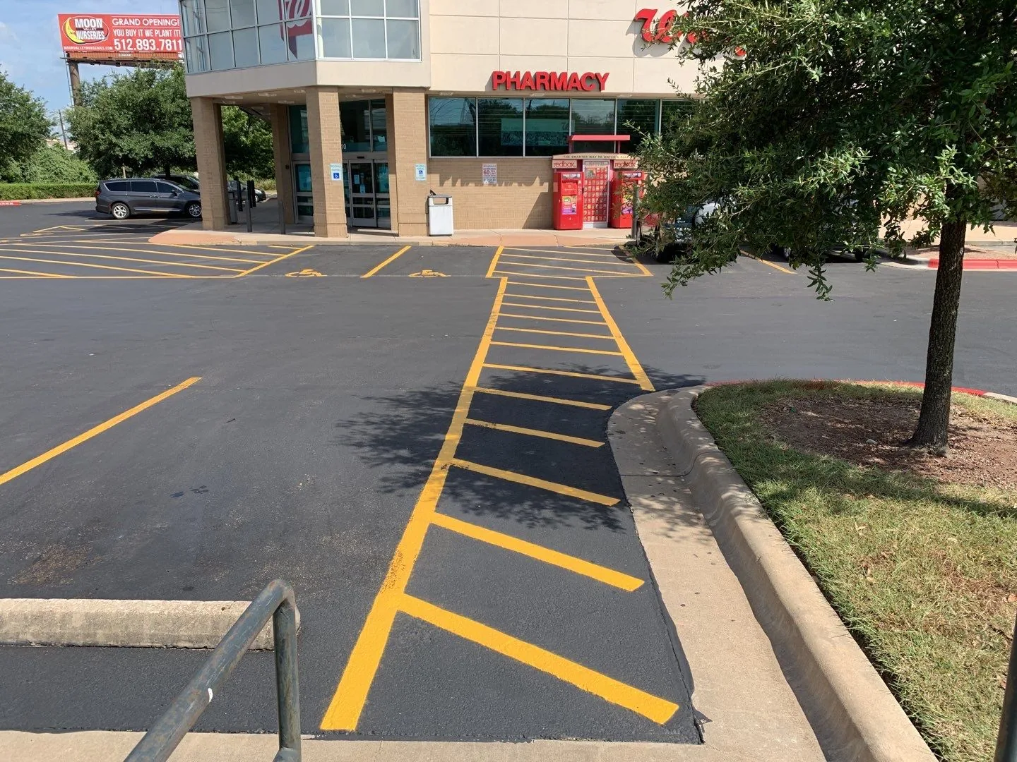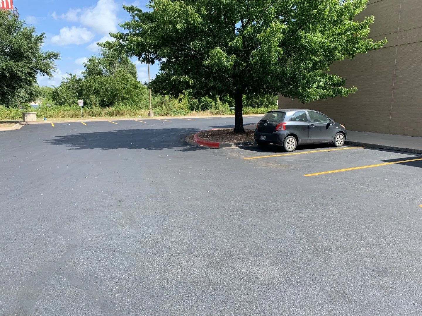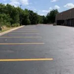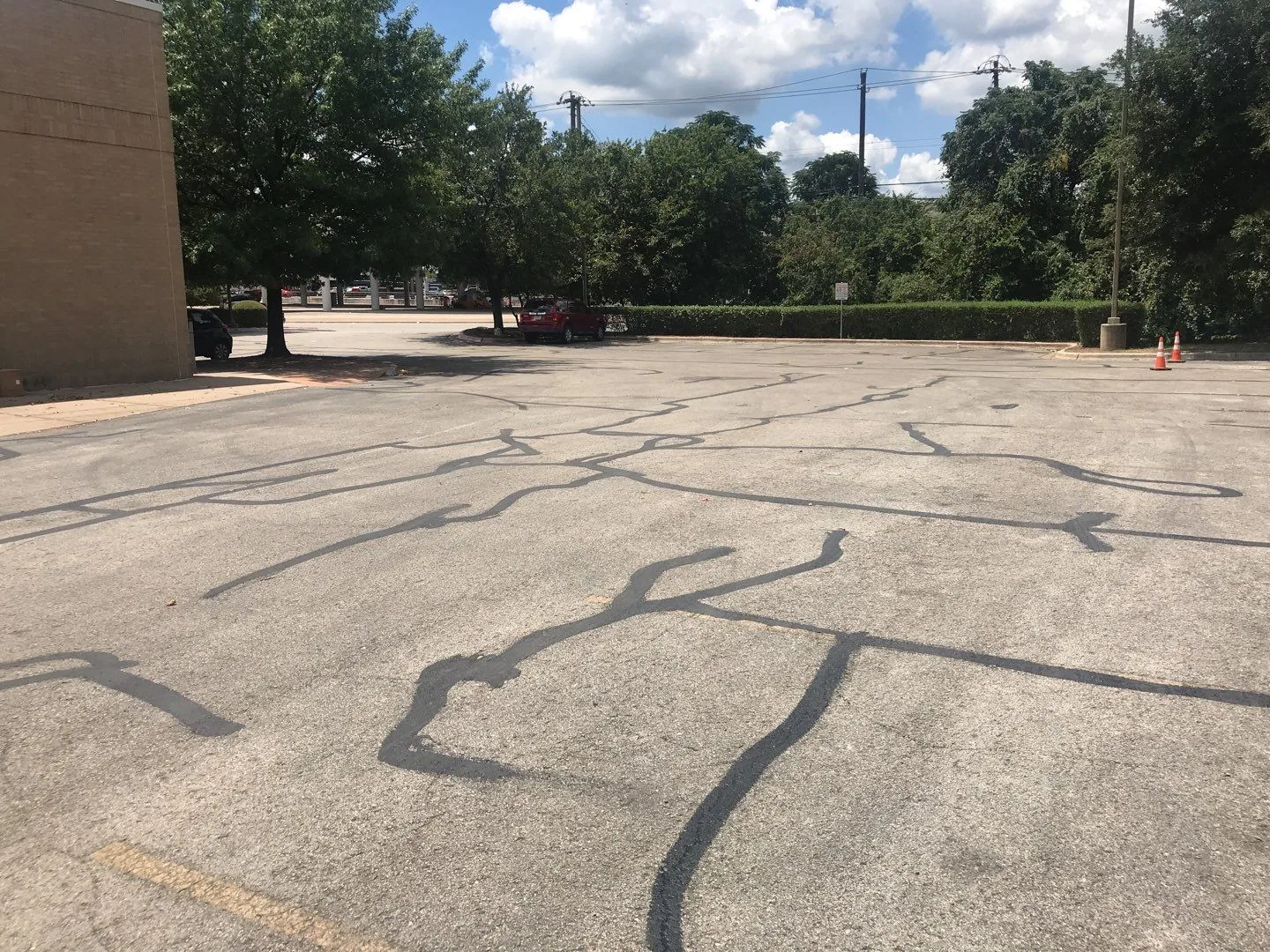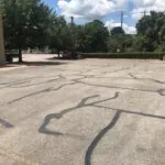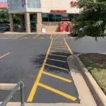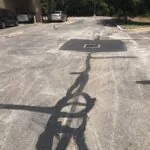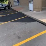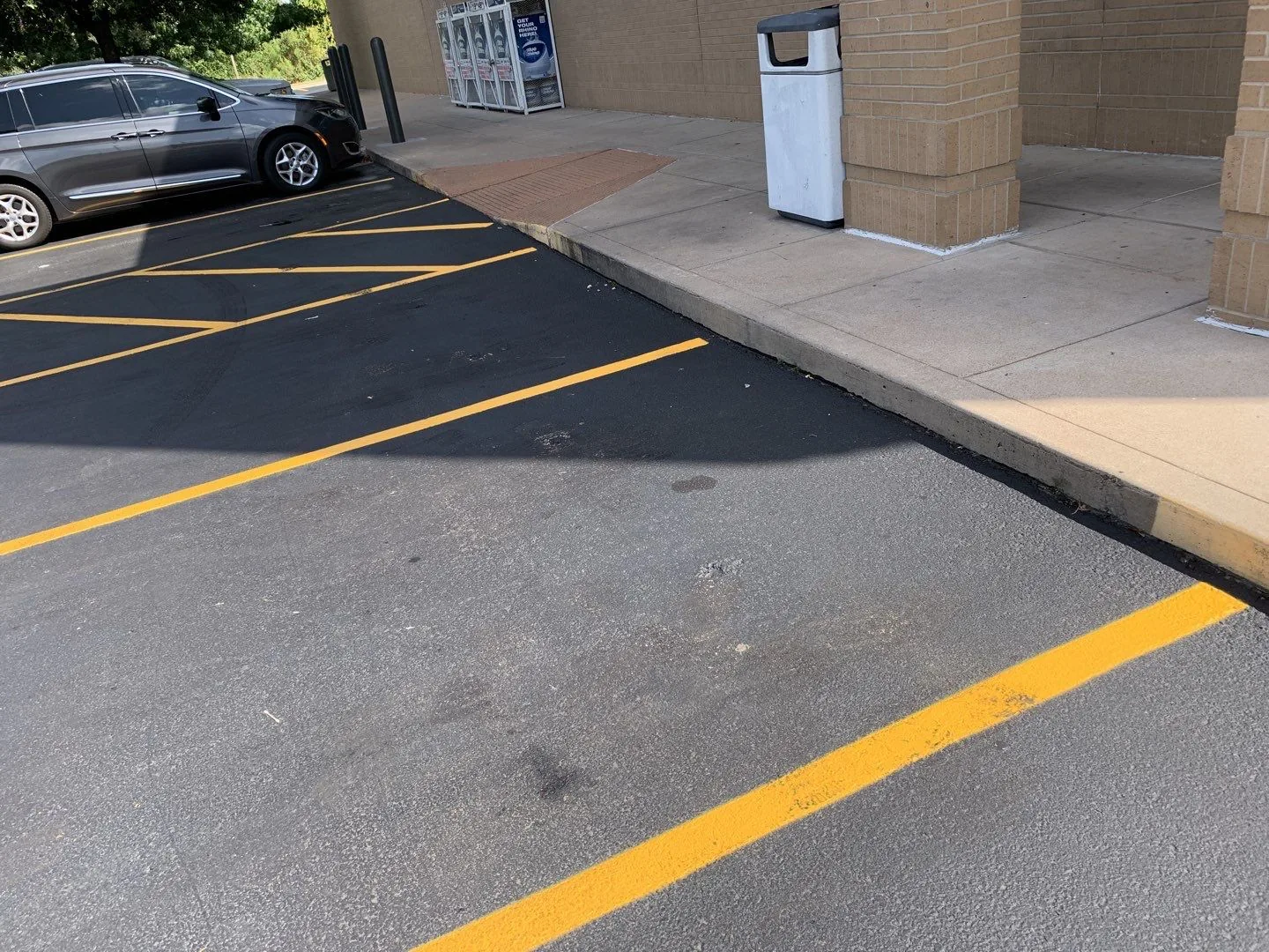 The project involved seven distinct services. The first was to repair six areas of pavement. The repairs totaled 1,831 square feet of pavement. Type D asphalt was chosen, and the repairs required 25 tons of asphalt. We used hot pour rubberized material to fill 1,750 linear feet of cracks. We installed five bollards to protect the Redbox kiosk and the propane cage from accidental or intentional vehicle crashes. We sealed more than 43,000 square feet of pavement with a premium sealant, Jennite AE®. We applied one squeegee coat and one spray coat, which required 1,730 gallons of sealant. Using the existing layout, we repainted all pavement markings and stripes, applying two coats to maximize visibility and longevity. As specified by the Americans with Disabilities Act, signs denoting accessible parking spaces must have a minimum height of 60 inches. We removed and replaced four signs, raising them to comply with the ADA. Lastly, there were four damaged car stops, and we handled that issue as well.