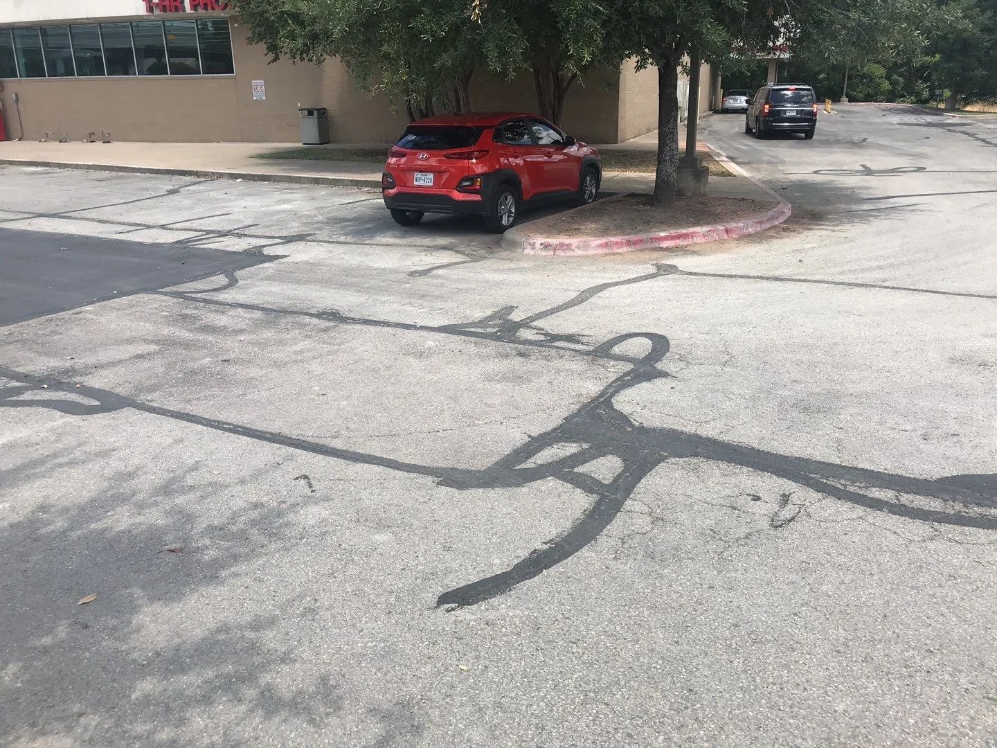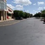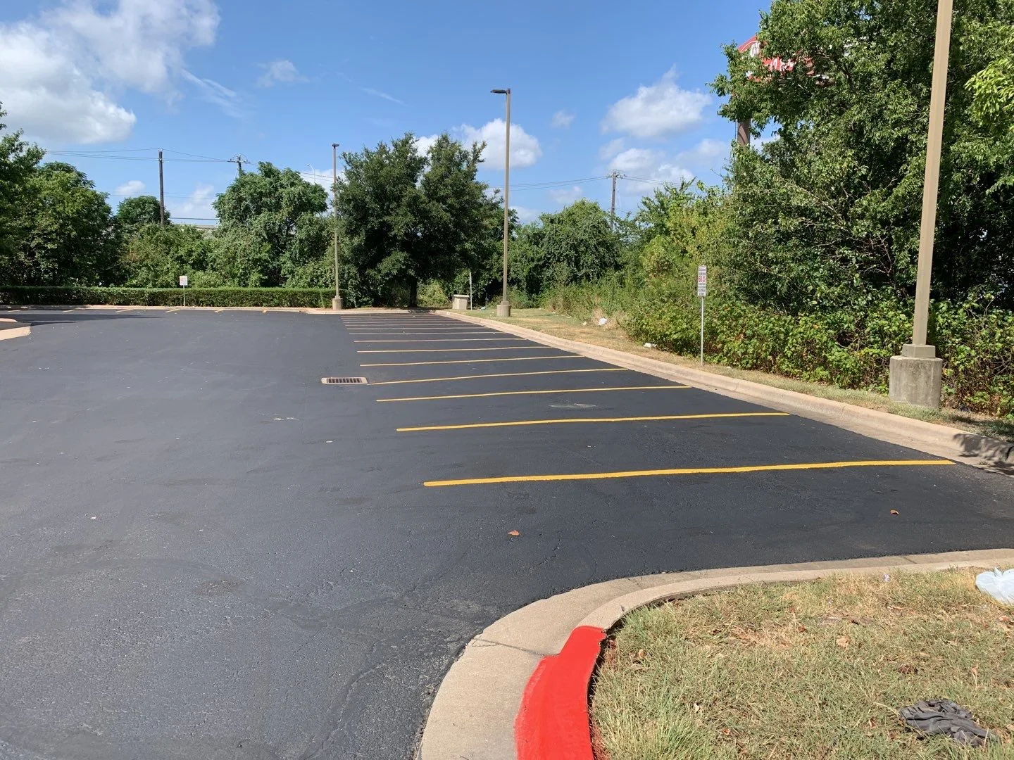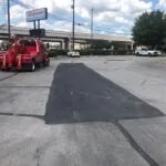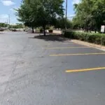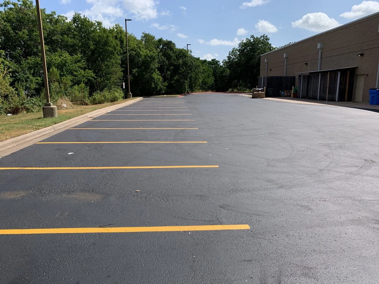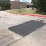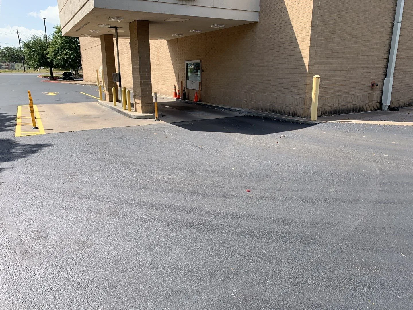 The project involved seven distinct services. The first was to repair six areas of pavement. The repairs totaled 1,831 square feet of pavement. Type D asphalt was chosen, and the repairs required 25 tons of asphalt. We used hot pour rubberized material to fill 1,750 linear feet of cracks. We installed five bollards to protect the Redbox kiosk and the propane cage from accidental or intentional vehicle crashes. We sealed more than 43,000 square feet of pavement with a premium sealant, Jennite AE®. We applied one squeegee coat and one spray coat, which required 1,730 gallons of sealant. Using the existing layout, we repainted all pavement markings and stripes, applying two coats to maximize visibility and longevity. As specified by the Americans with Disabilities Act, signs denoting accessible parking spaces must have a minimum height of 60 inches. We removed and replaced four signs, raising them to comply with the ADA. Lastly, there were four damaged car stops, and we handled that issue as well.