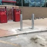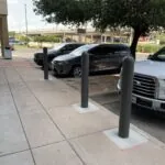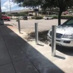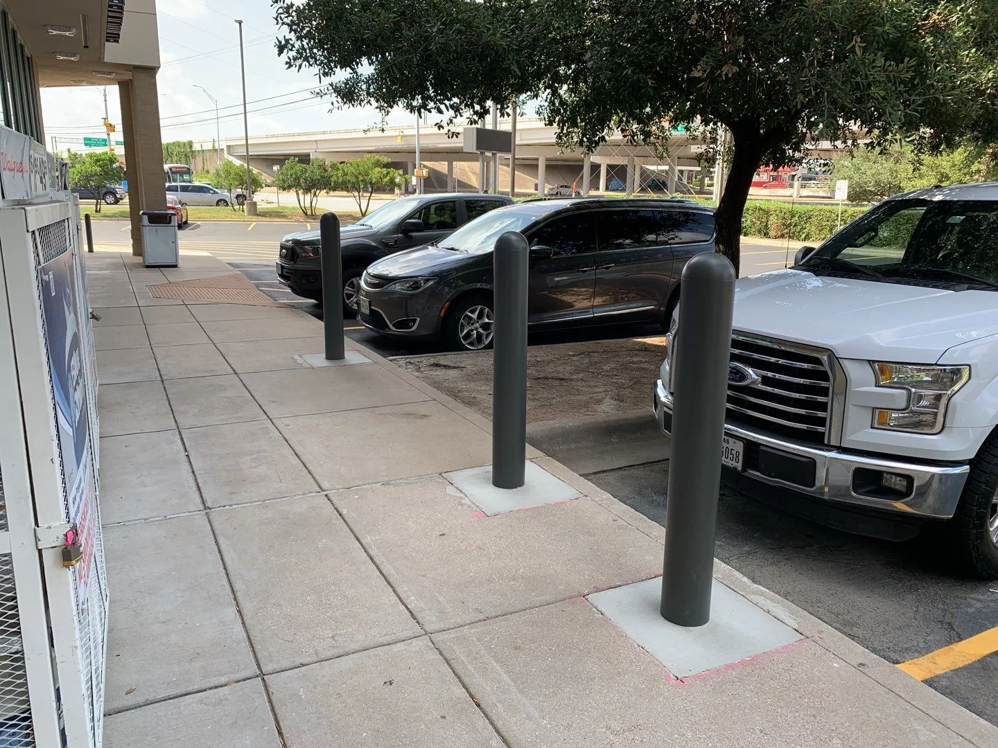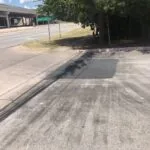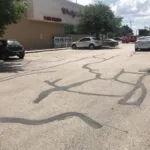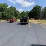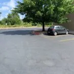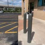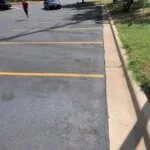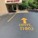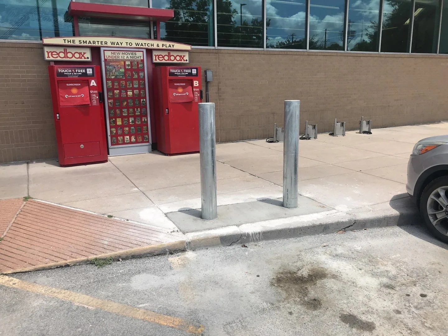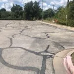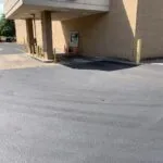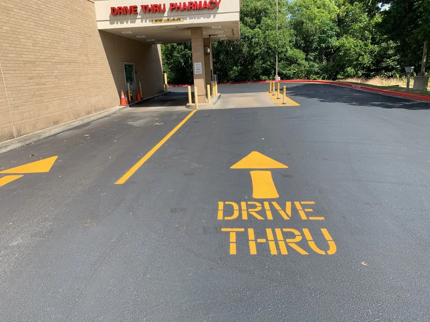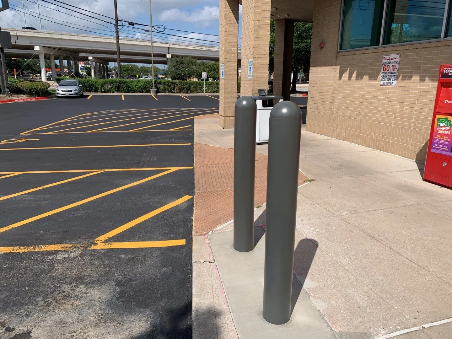 The project involved seven distinct services. The first was to repair six areas of pavement. The repairs totaled 1,831 square feet of pavement. Type D asphalt was chosen, and the repairs required 25 tons of asphalt. We used hot pour rubberized material to fill 1,750 linear feet of cracks. We installed five bollards to protect the Redbox kiosk and the propane cage from accidental or intentional vehicle crashes. We sealed more than 43,000 square feet of pavement with a premium sealant, Jennite AE®. We applied one squeegee coat and one spray coat, which required 1,730 gallons of sealant. Using the existing layout, we repainted all pavement markings and stripes, applying two coats to maximize visibility and longevity. As specified by the Americans with Disabilities Act, signs denoting accessible parking spaces must have a minimum height of 60 inches. We removed and replaced four signs, raising them to comply with the ADA. Lastly, there were four damaged car stops, and we handled that issue as well.